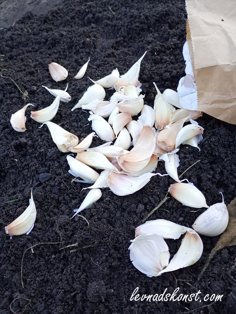 nu är kommande säsångs vitlök i backen. någonstans mellan 120-130 klyftor av tre olika sorter planterade jag medans vinden blåste spåspik runt öronen på mej. therador, primor och cledor – samtliga eko – satsar jag på nu, har haft eget utsäde under flera år men i år blev samtliga klyftor så små att jag fattade beslutet att köpa in nytt. de är planterade i två pallkragar samt på friland.