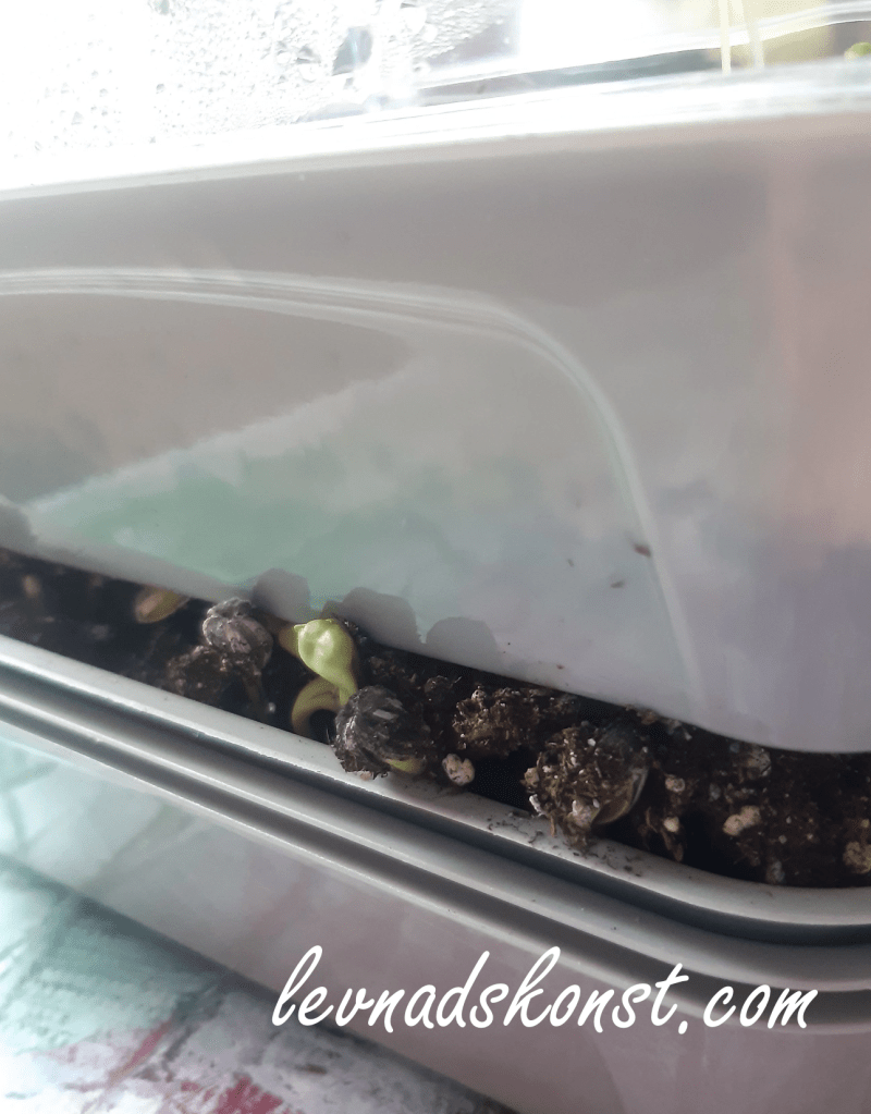 från plantering till färdigt mikrogrönt tar det ca 10 dagar. jag odlar i ett kärl avsett för mikrogrönt från känd firma, men du kan använda vad som helst! det viktiga är att det finns hål i botten för vattnet att rinna bort. jag använder, den här årstiden såjord av god kvalitet, när det tinat ute odlar jag mikrogrönt i kompostjord. jag har ingen extra värme eller belysning. kärlen placerar jag på fönsterbrädet.