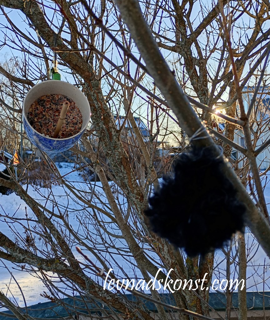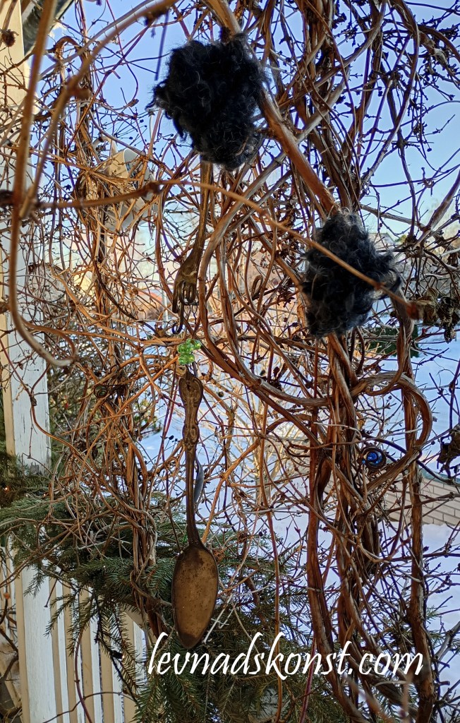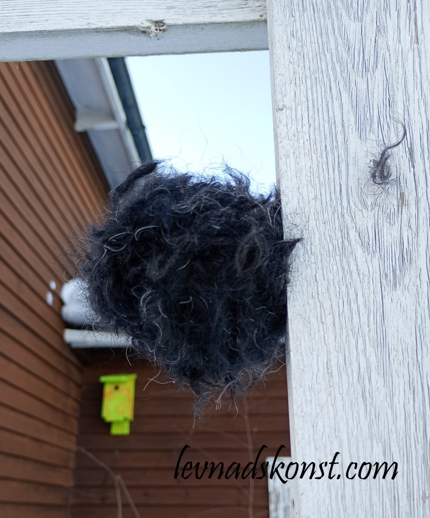 Jag snurrade ihop pälsen till små bollar som jag najjade ihop med ståltråd och sen satte jag upp dom på olika platser i trädgården så nu finns den där att använda vid tillfälle, ska bli intressant att se hur länge den finns kvar när vi närmas oss säsongen för att boa.