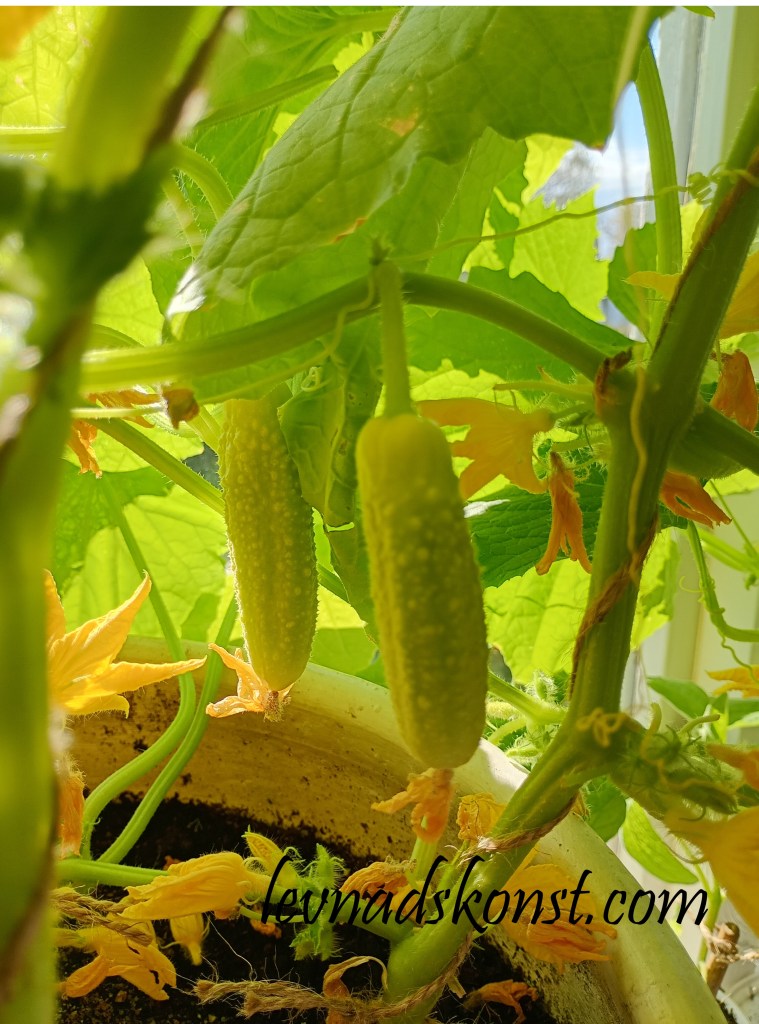 Jag har ätit några gurkor redan och nu får jag vänta en stund tills jag har fullvuxna mogna gurkor igen i sovrumsfönstret. Sorten är en kulturarvssort som heter Arboga Vit, en klar favoritgurka i det här hemmet.