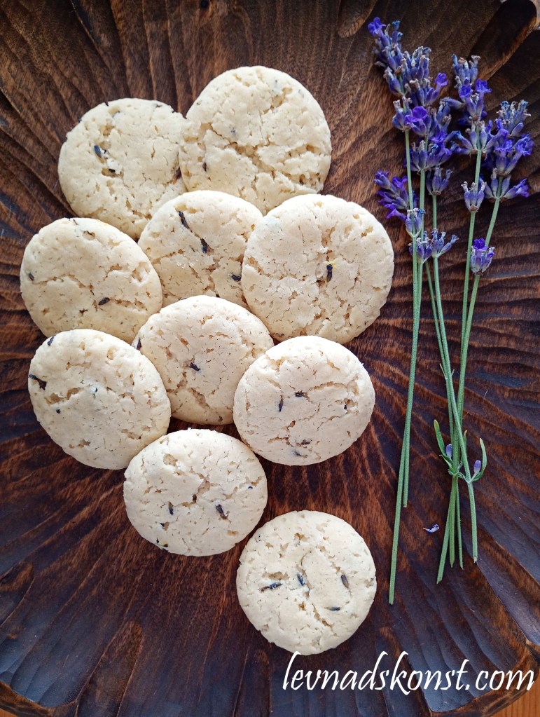 I dessa använde jag färska lavendelblommor från trädgården, men det går lika bra med torkade. I receptet jag följer blir det 20 kakor och jag tillsätter 1 rågad matsked med blommor.