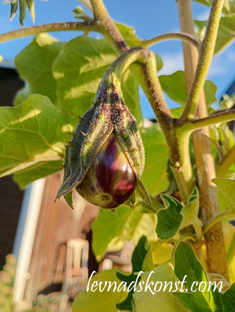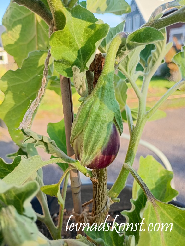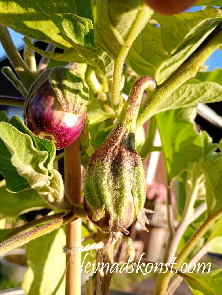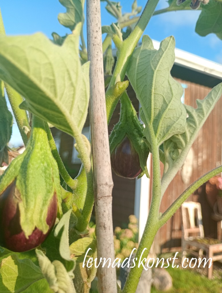 Mina aubergineplantor har jag i väl tilltagna krukor, de har stått mot en vägg under sommaren och de har haft många soltimmar och strålningsvärme från väggen, nu håller jag extra koll på dom och väderappen för att ha plantorna ute så länge som möjligt och samtidigt försöka förhindra att de blir utsatta för kyla.