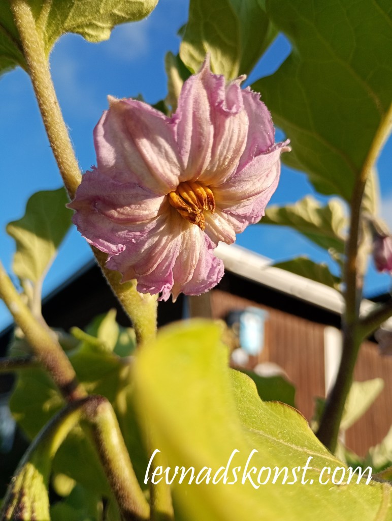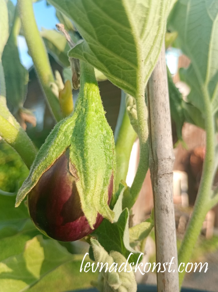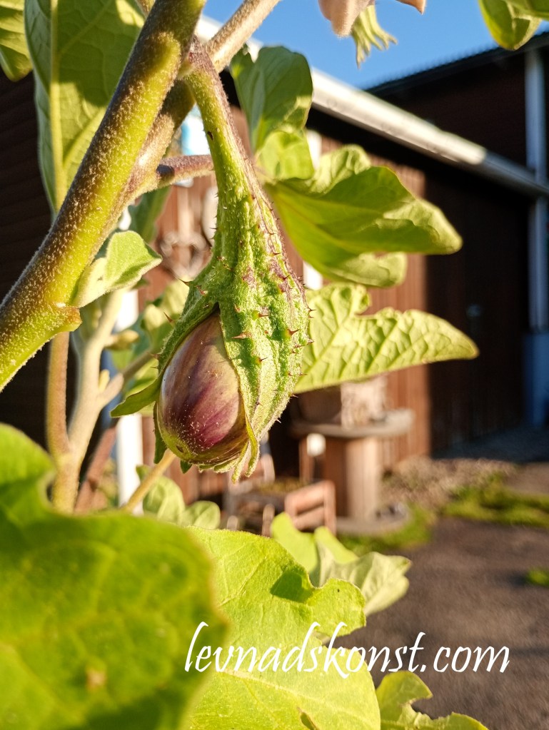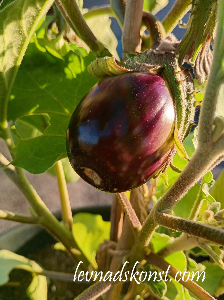Mina aubergineplantor har jag i väl tilltagna krukor, de har stått mot en vägg under sommaren och de har haft många soltimmar och strålningsvärme från väggen, nu håller jag extra koll på dom och väderappen för att ha plantorna ute så länge som möjligt och samtidigt försöka förhindra att de blir utsatta för kyla.