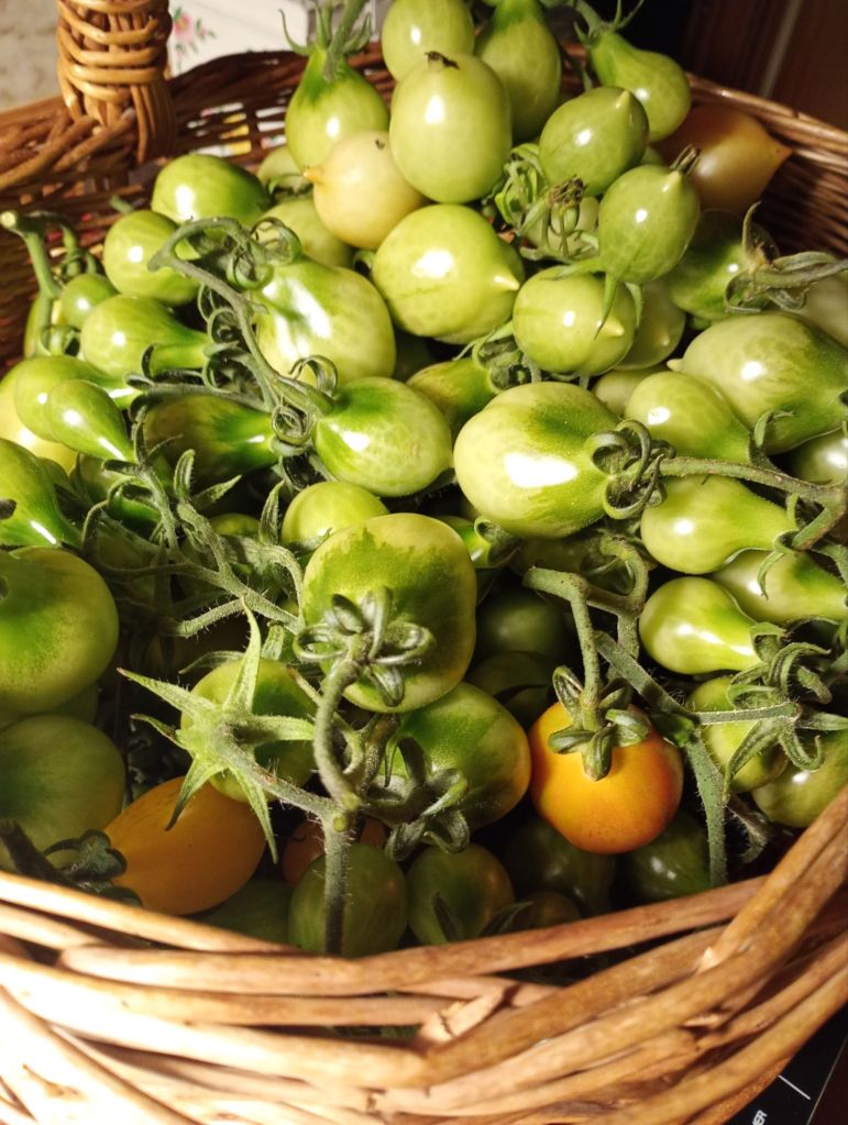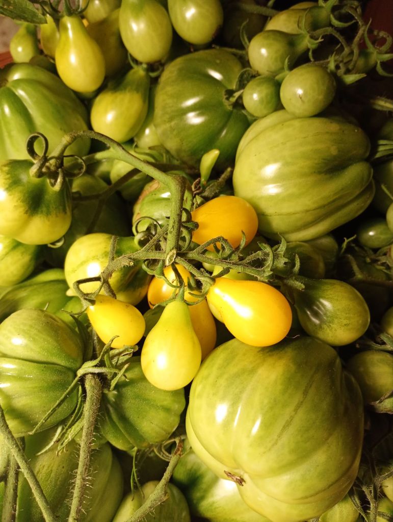 Det är italienska vintertomater aka piennolotomater, en yellow pearshape & Canestrino di Lucca. Nu kommer jag att kunna plocka mogna tomater från sovrumsfönstret under lång tid framöver.