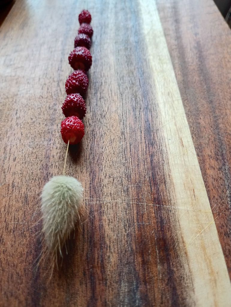 Till frukost idag kunde jag överraska min man med ett grässtrå fyllt med smultron från trädgården. Plantorna har jag fröstått & de har skänkt oss smultron sedan tidig sommar & kommer fortsätta göra så ända fram till frosten då de har massor av blommor & omogna bär. De är planterade utmed kanten på min fjäril/pollinerarbädd & min förhoppning är att de kommer att kunna täcka upp kanten på hela långa bädden inom två år, den är ca 30-40 meter.