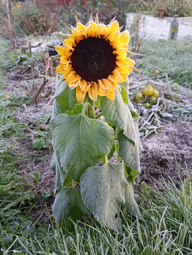 Vi har haft en helt magisk höst så här långt, strålande solsken från en klarblå himmel nästan varje dag. Kyligare luft för varje dag som gått & ändå har dygnstemperaturen legat på plussidan, ända tills den här natten. Nu ligger frosten & gnistrar i ett tunnt lager som täcker allt så jag behöver ta en runda i trädgården idag & plocka undan vattentunnor, fågelbad osv.